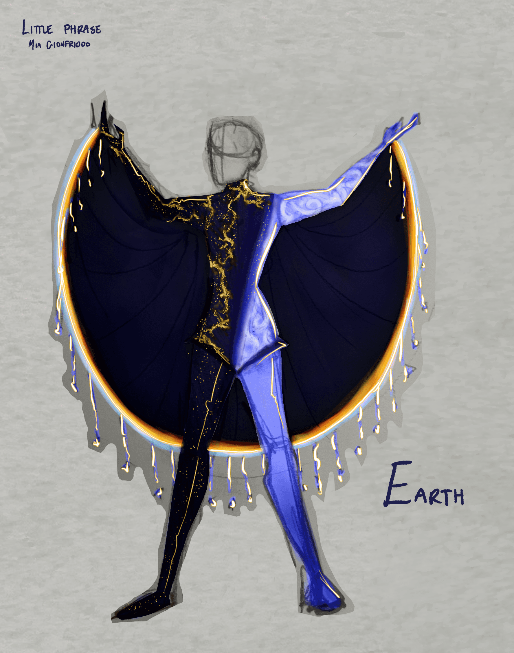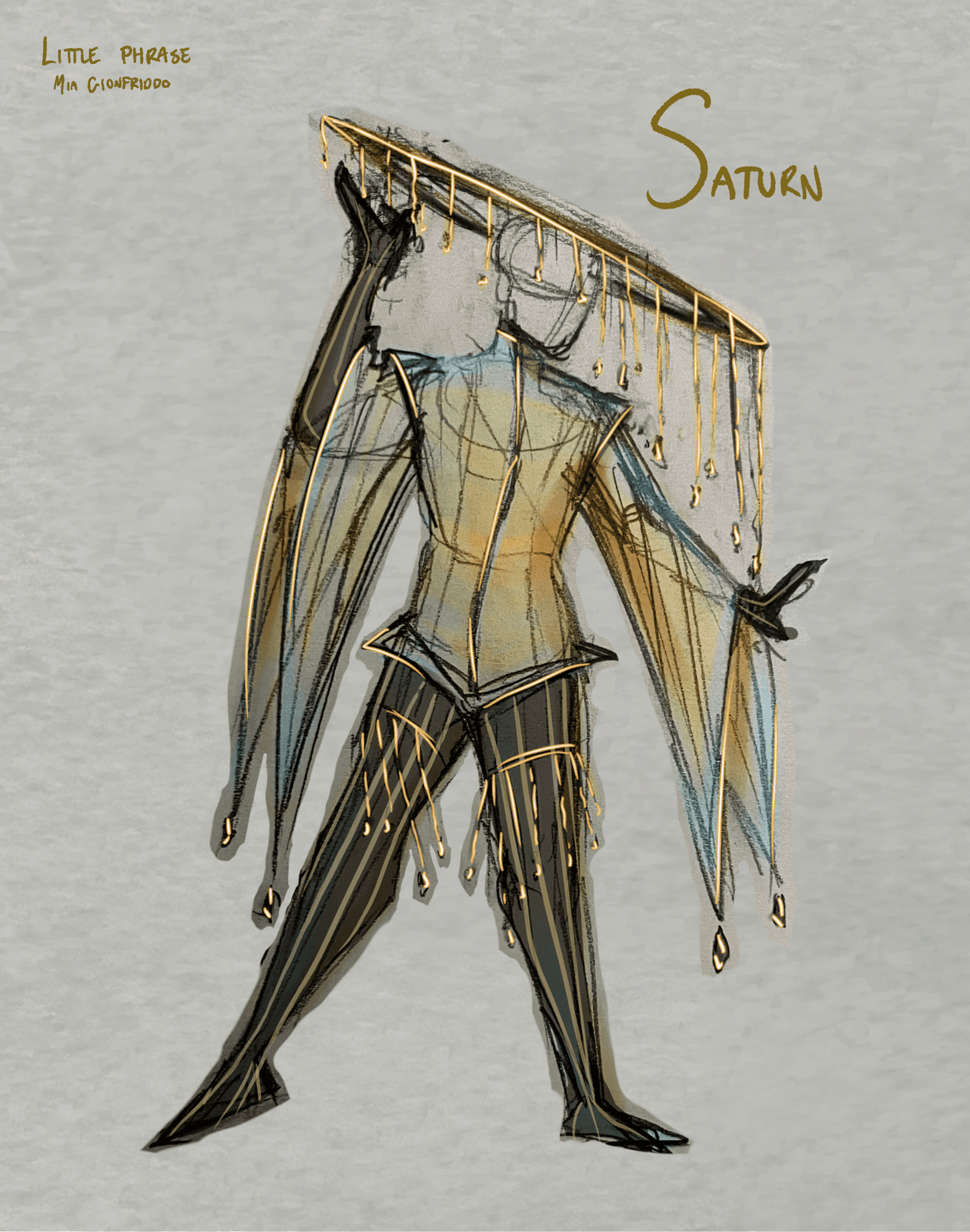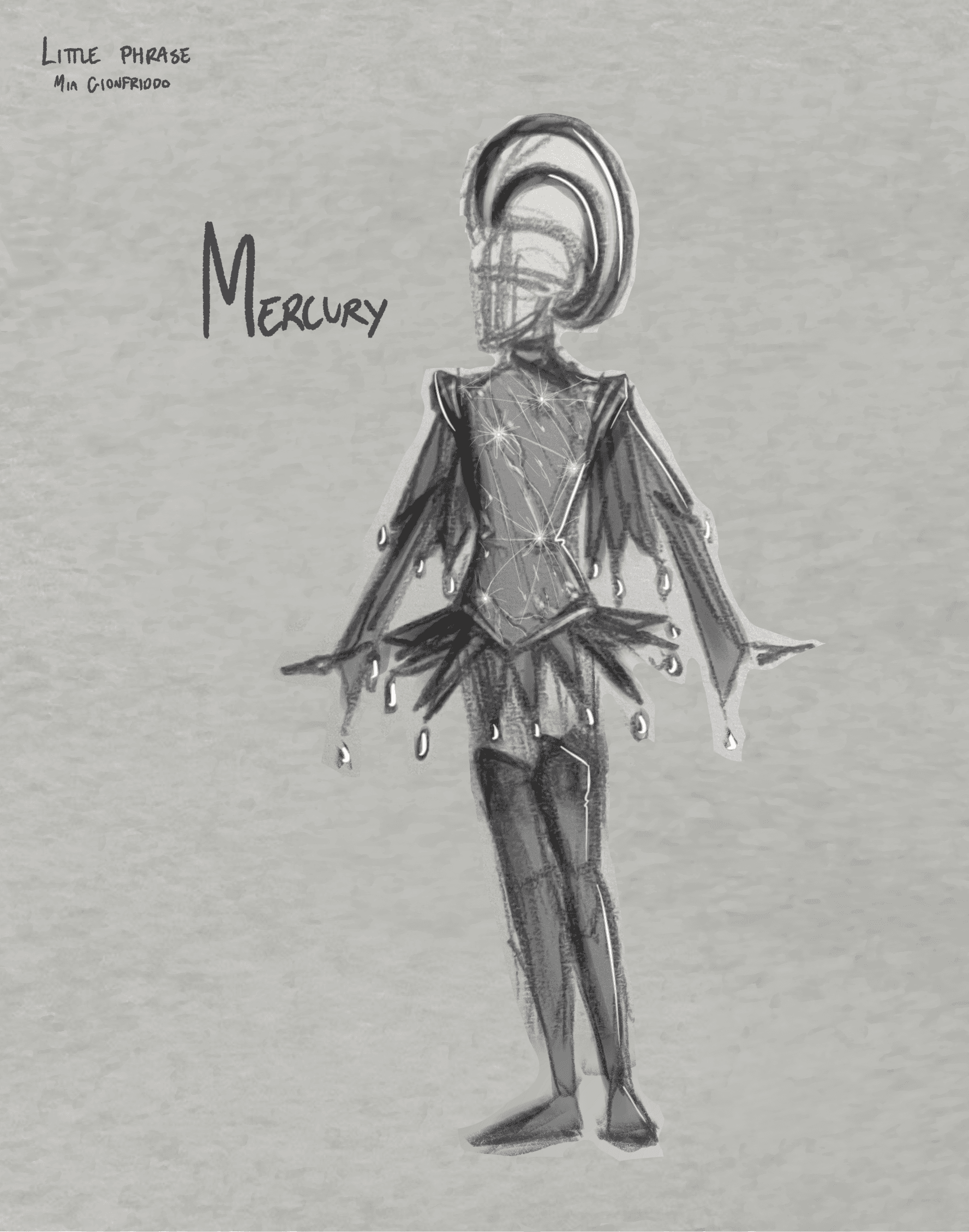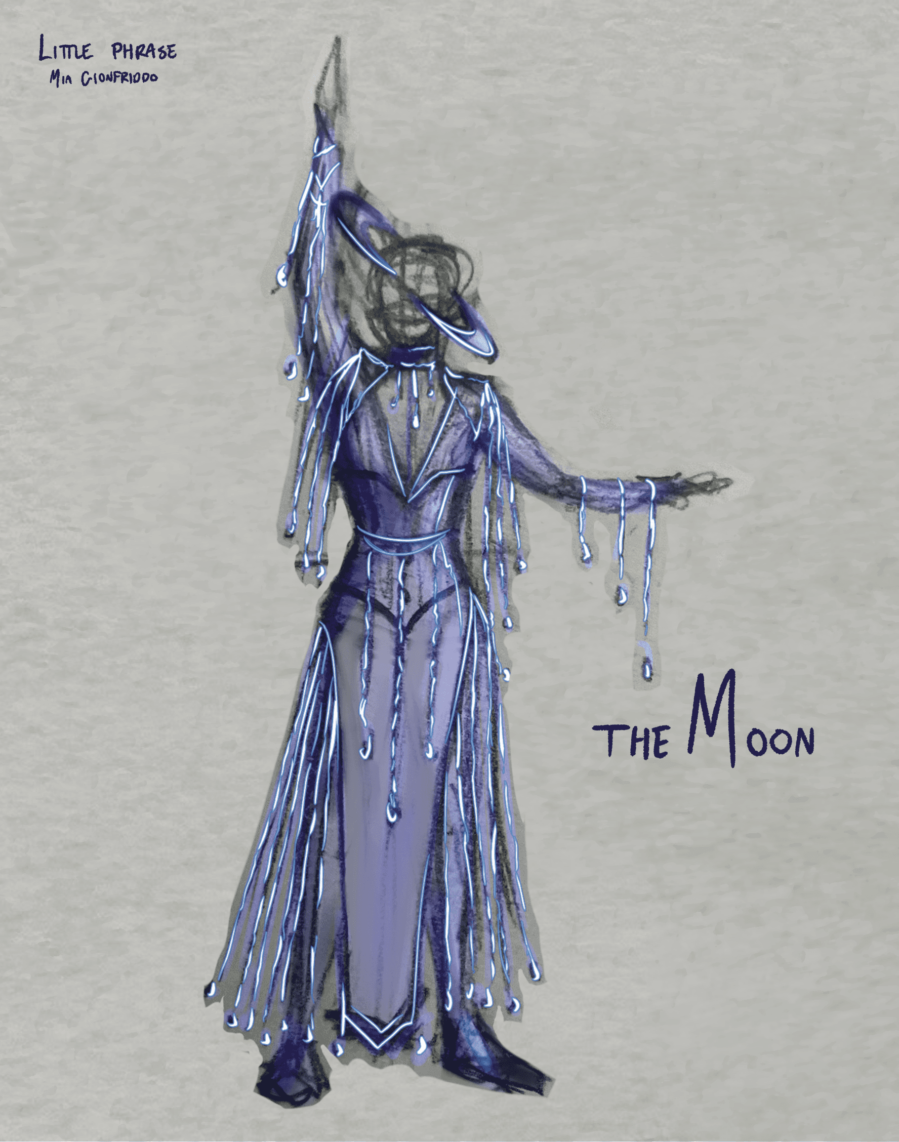 A theoretical design assessment done for Production Studio 3. Costumes designed for the dance piece 'Little Phrase', by Rheannan Port. Selected costume renders shown.
